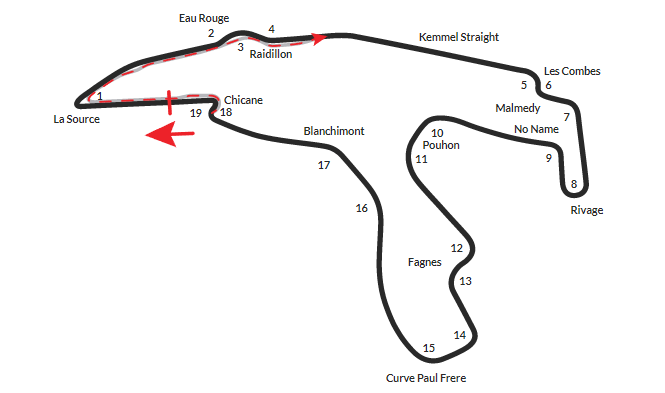 Approach La Source with a late apex, hugging the inside curb. Brake early and smoothly, gradually releasing the brake as you enter the corner. Aim to carry good momentum onto the straight leading to Eau Rouge.