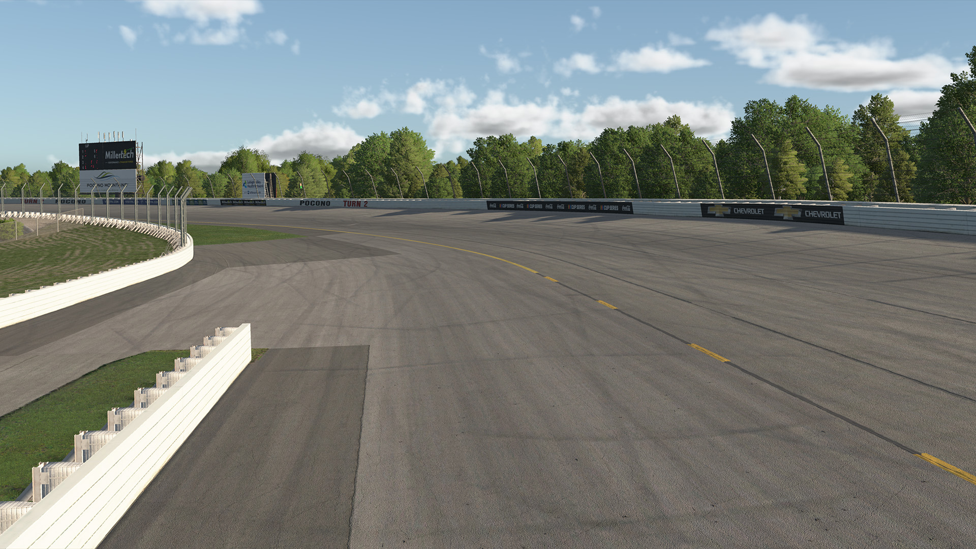 Pocono Raceway was released in iRacing to bring one of NASCAR’s most unique ovals to the sim. Known as “The Tricky Triangle,” Pocono’s 2.5-mile layout features three distinct corners, each modeled after turns from other iconic circuits: Turn 1 after Trenton Speedway, Turn 2 (the Tunnel Turn) after Indianapolis, and Turn 3 after Milwaukee.