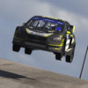 A 3D-rendered off-road buggy jumps mid-air on a dirt track, with its suspension fully extended and a blurred forest background resembling iRacing graphics. A 3D-rendered off-road buggy jumps mid-air on a dirt track, with its suspension fully extended and a blurred forest background resembling iRacing graphics.